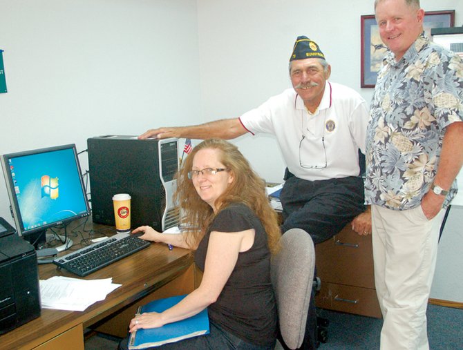 With the installation of new office equipment, Sunnyside American Legion Post 73 will now be able to help area veterans with service claims in a more timely manner, according to Post Commander Troy Monholland (center). Pictured in the new office with Monholland are DeLessa Restucci, post adjutant; and post finance director Nate Bridges, who donated the office space for the post’s use. Photo by Julia Hart.